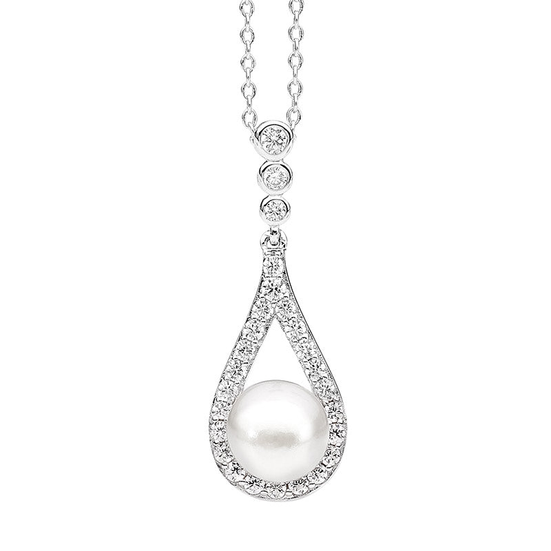 STERLING SILVER CZ BEZEL WITH OPEN TEAR DROP & FRESHWATER PEARL PENDANT