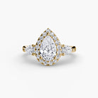 A unique take on the classic three-stone ring, this design is enhanced with a radiant halo for amplified brilliance and symbolism. Timeless with a modern twist.