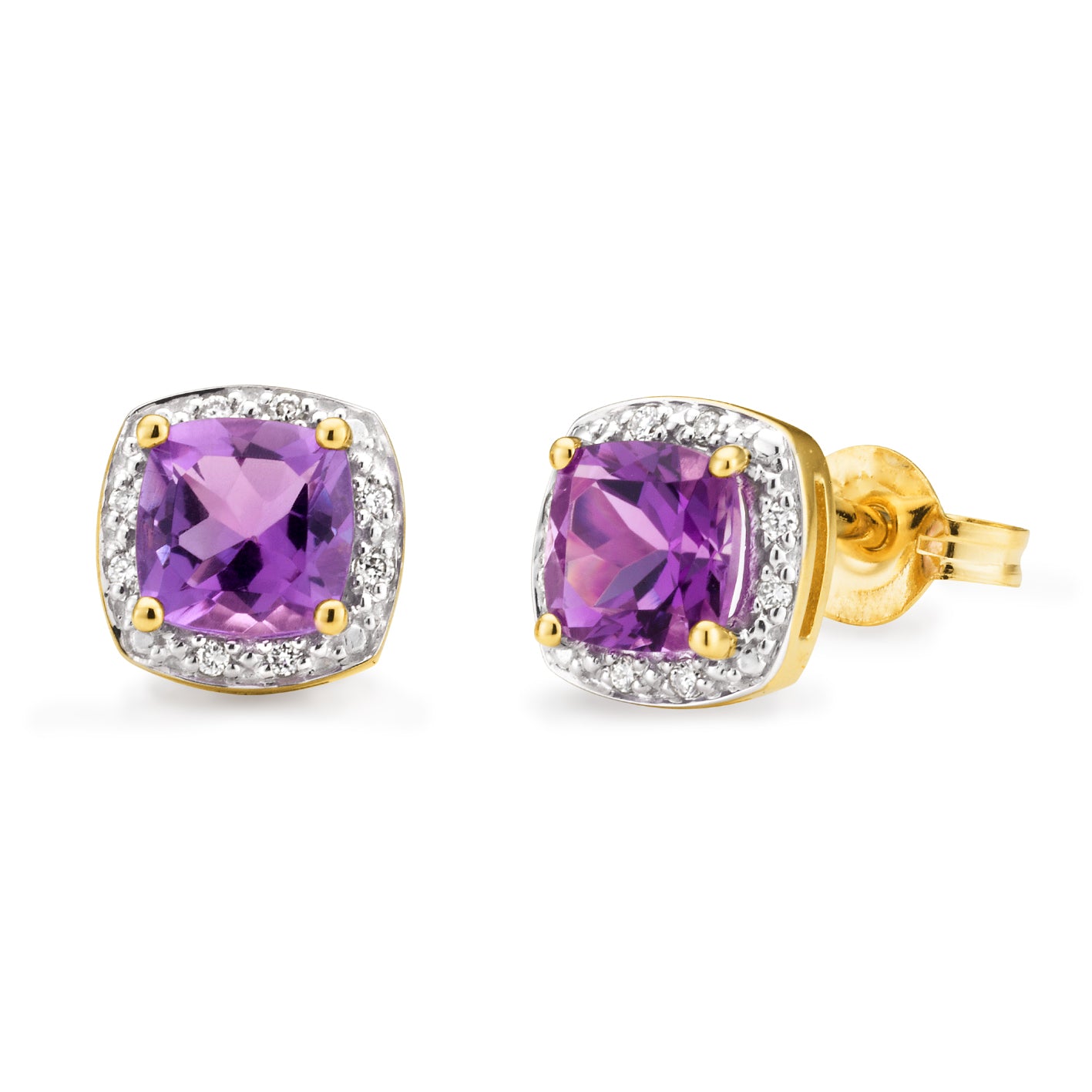 9CT YELLOW GOLD EARRING 2 X AMETHYST 5MM CUSHION 4 CLAW DIAMOND 16 X 0.005CT SI3 JKL R/PLATED BEAD SET HALO