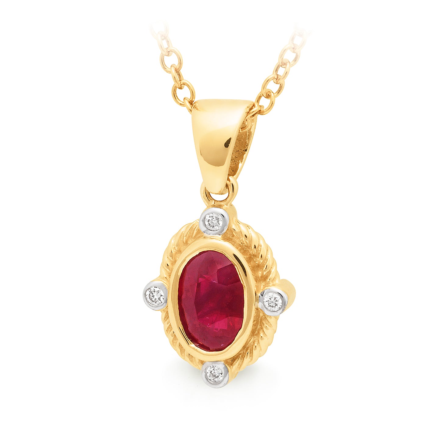 9 CARAT YELLOW GOLD PENDANT 1XRUBY OVAL BEZEL DIAMOND 4X0.005CT APP SI3 JKL BEZEL SET ROPE SURROUND R/P DIAMOND BEZEL